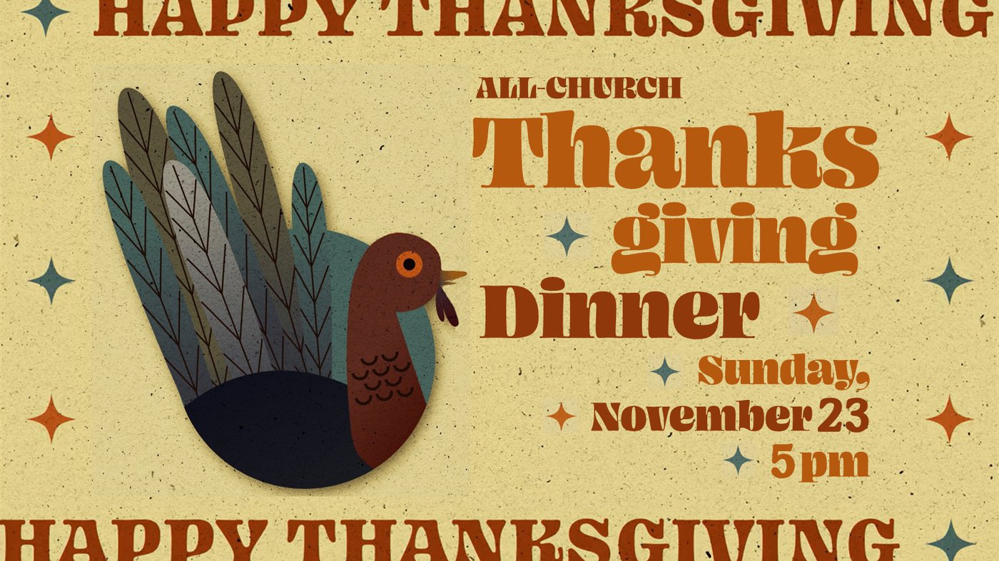 Mark your calendars for our annual Thanksgiving Turkey Dinner! The date is Sunday, November 23 at 5 pm. Sign up to bring side dishes and/or desserts on the sheet on the Information Counter in the foyer or use the form below. Questions? Contact Pastor Tom or Rich. We'll also need a few volunteers to cook a turkey, turkey breasts, or, new for this year a ham (the church provides the meat)! Everyone’s welcome — so go ahead & invite friends!