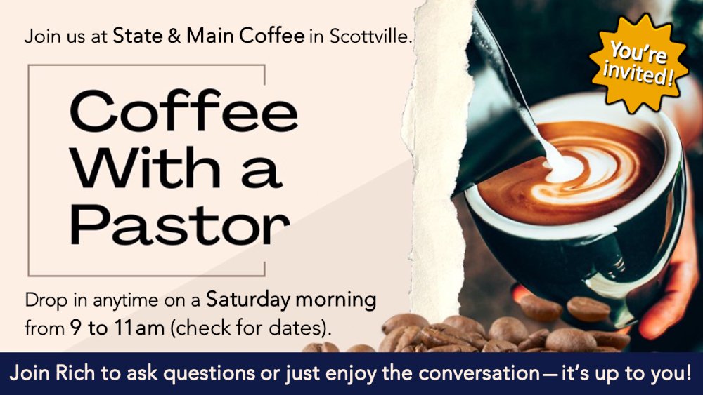 Pastor Rich will be at State & Main Coffee in Scottville on Saturday, April 11 from 9 to 11am. Drop in any time and join the conversation!